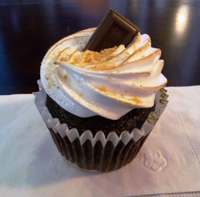I had a S’mores cupcake featuring graham cracker crust, chocolate cake, marshmallow fluff icing slightly toasted sprinkled with graham cracker & topped with a chunk of Hershey bar.