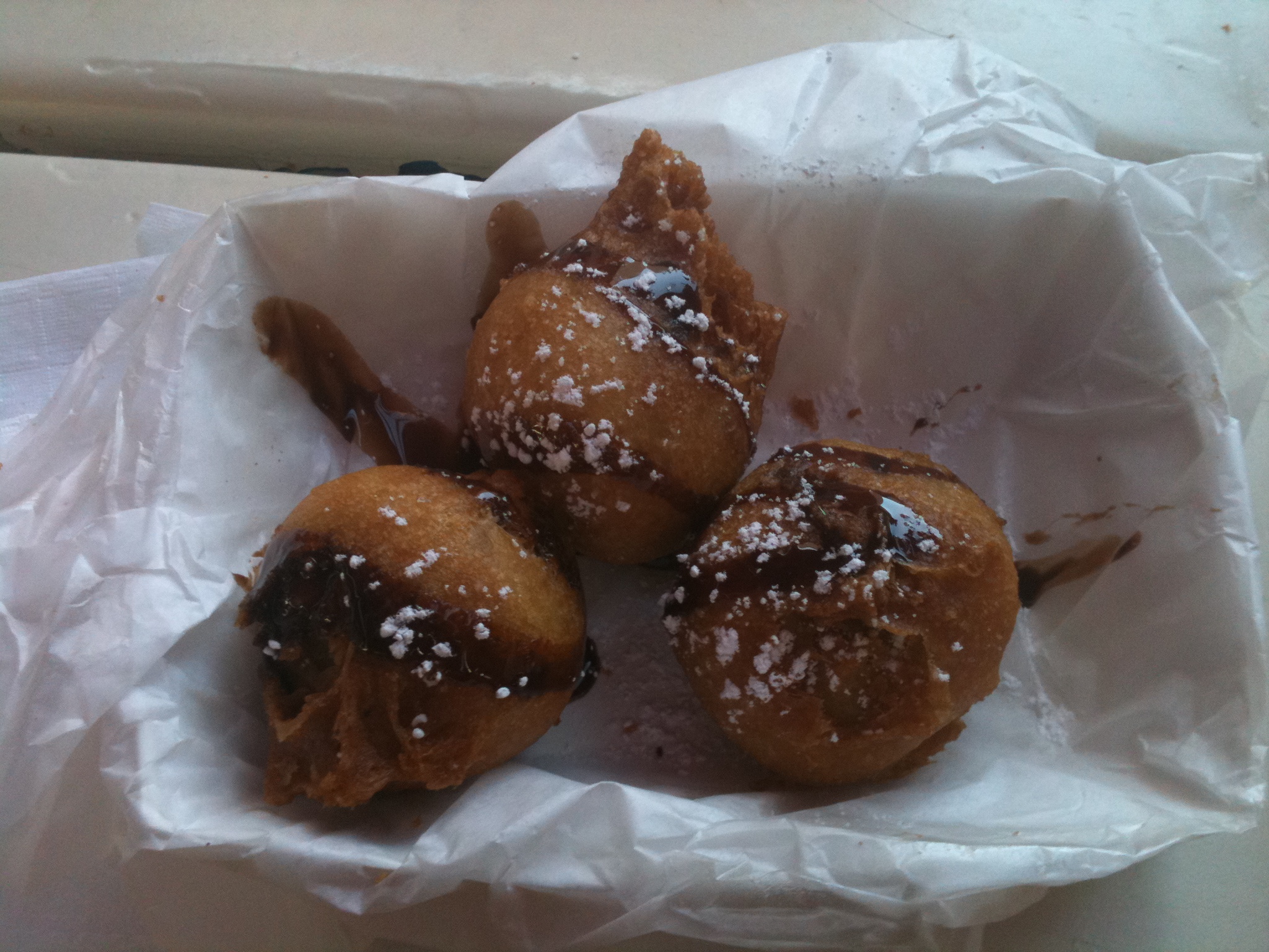 These little puppies were thinly spiral sliced fried potatoes covered in cheese sauce. Yummm. Simple and delicious. Next I had a Fletcher’s corn dog, and I don’t have a picture because I was too excited and I ate it before I remembered to take a picture of it. Oops. It was not the usual plain ol’ dog however. It was the jalapeno cheese version! It took Fletcher’s to a whole new level of awesome. Finally, I rounded out my day with some award-winning Fried Cookie Dough: