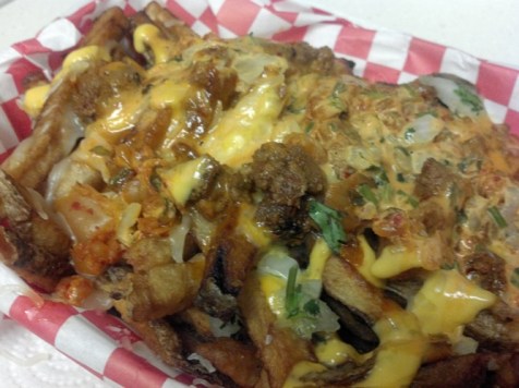 Fresh cut fries topped with your choice of pork, chicken, beef or tofu, monterey jack, cheddar cheese, cilantro, onion, caramelized kimchee and spicy mayo.