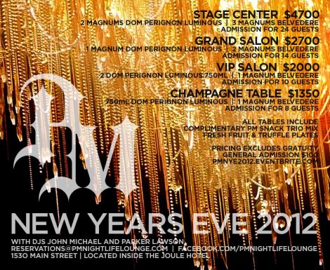 PM Nighlife Lounge is having an ultra chic (or at least it better be at these prices) New Years Eve Celebration featuring DJ Parker Lawson.
