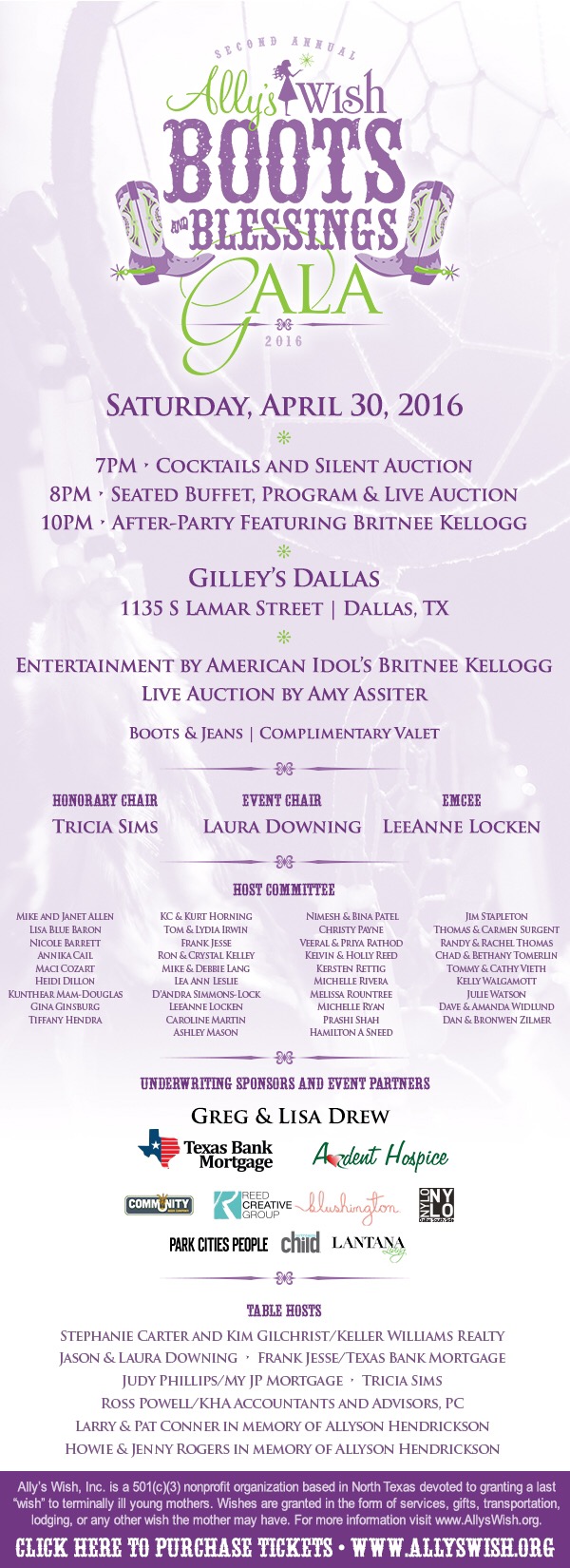Tickets are available now for the 2nd Annual Boots & Blessings Gala benefiting Ally’s Wish.