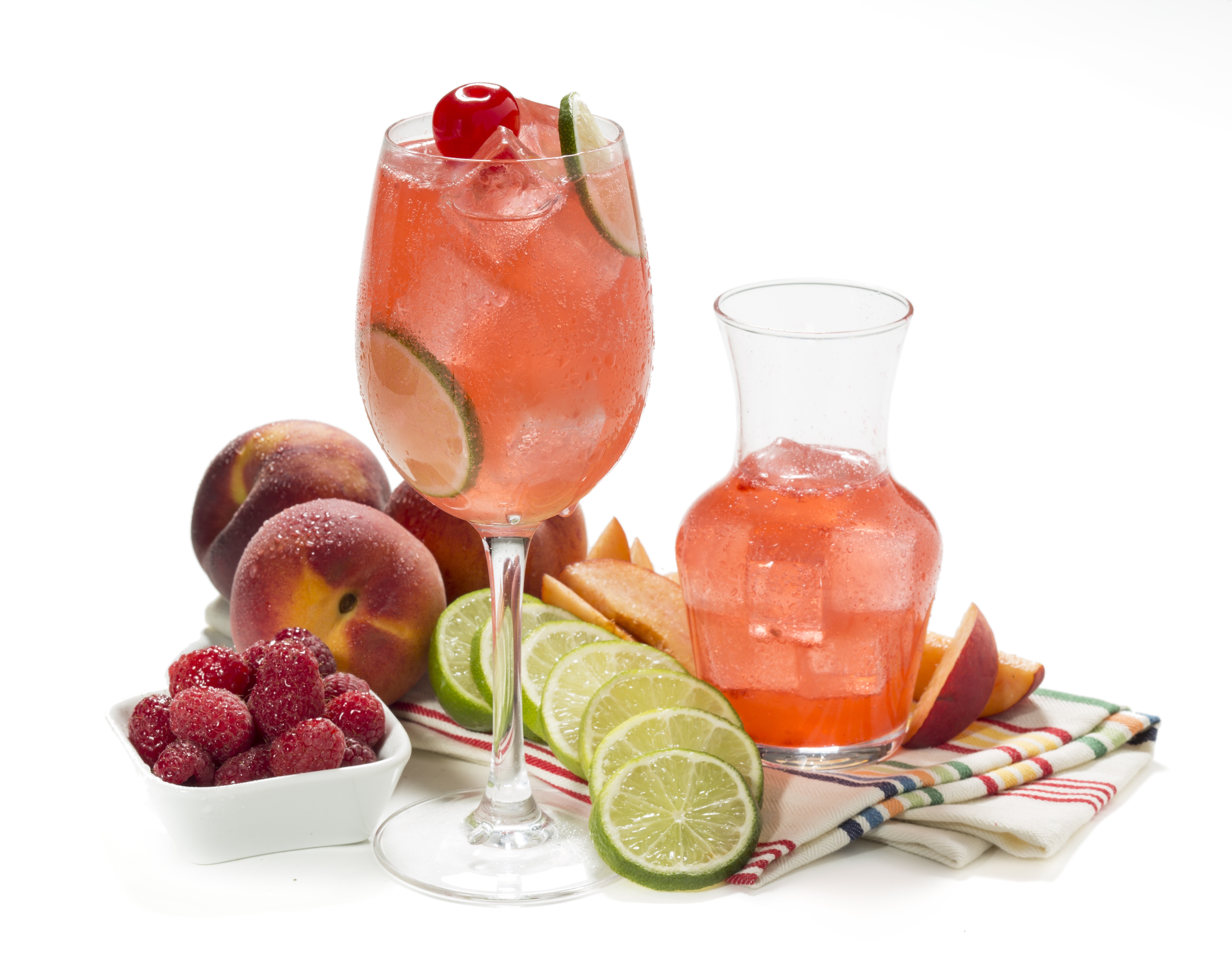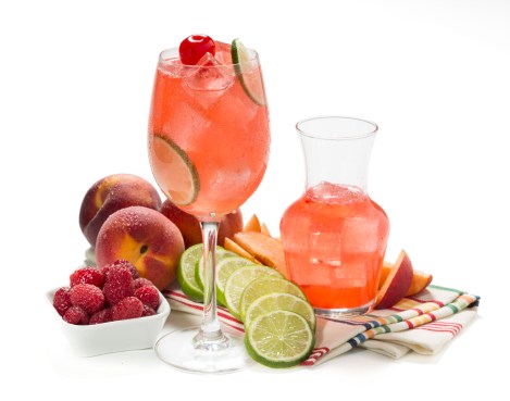 Raspberry Peach Sangria: Grand Marnier Signature Collection Raspberry Peach liqueur, Chateau Ste. Michelle Riesling and fresh sour, shaken with raspberries.