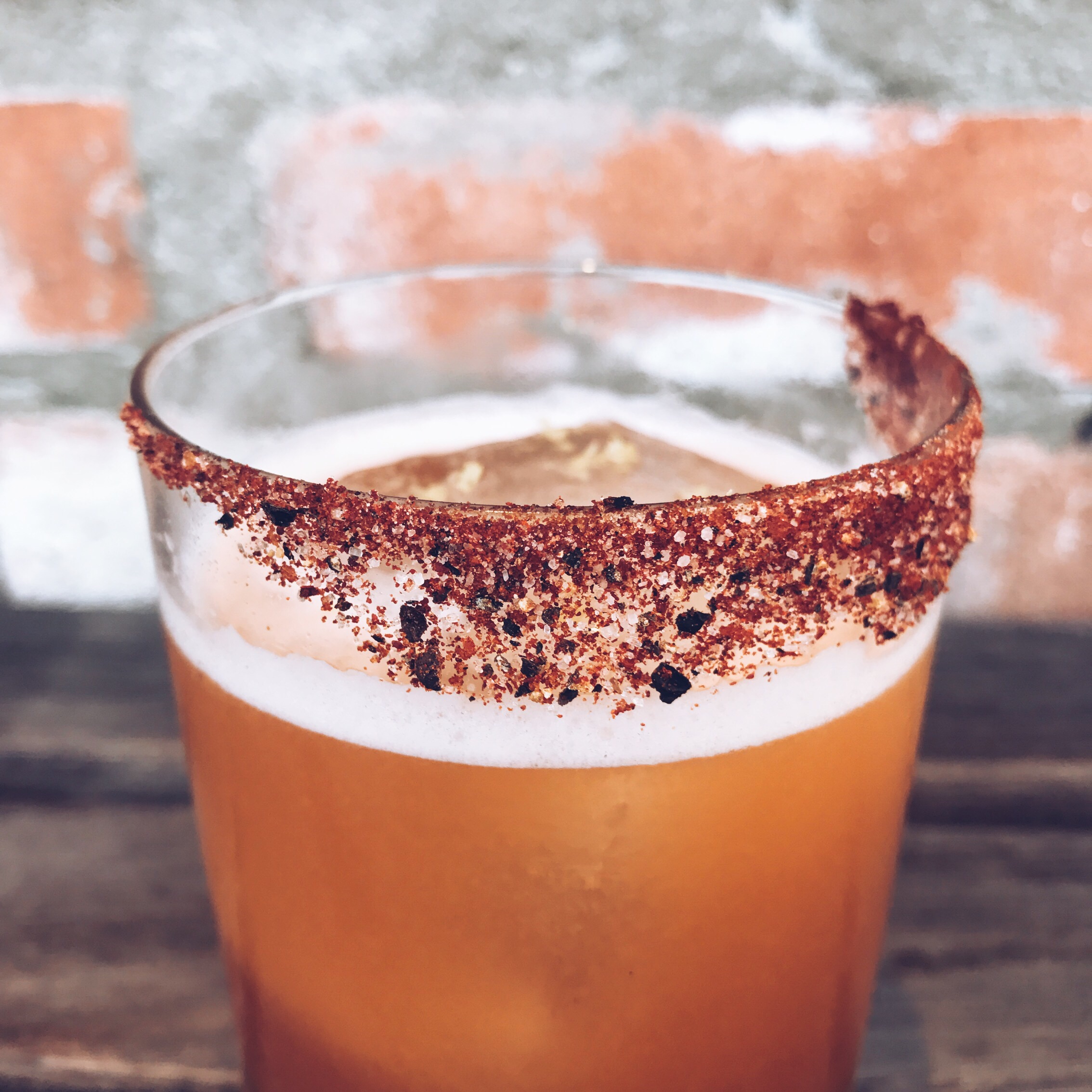 Fruity and fresh, this cocktail blends a house-made sweet corn stock syrup with pineapple extract, fresh lemon, sea salt, Angostura bitters, blanco tequila and espadín mezcal. The glass is garnished with a blend of smoked hot paprika, sugar, sea salt and black pepper for added flavor. Isn’t this the most beautiful drink you have ever seen?! It looks just like a sunset.
