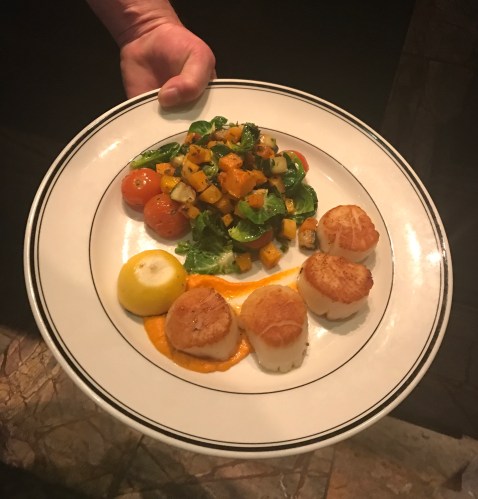 What: Sea Scallops – Pan-seared on smoked carrot puree with roasted vegetables