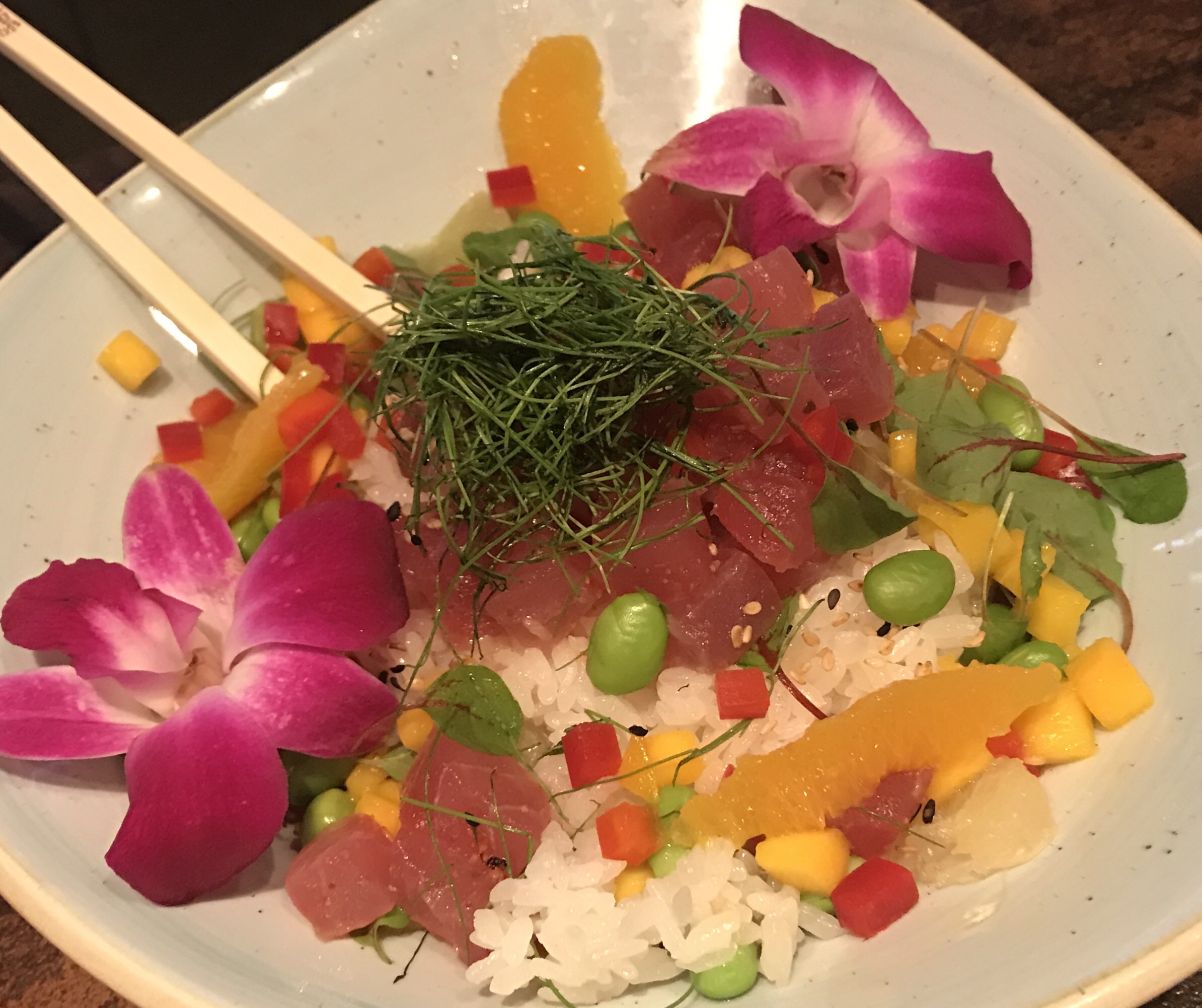 What: Miso Poke Tuna – Ahi tuna marinated in traditional poke sauce, sushi rice, wasabi, heirloom cherry tomatoes, mango, hearts on fire, micro greens, mixed peppers, togarashi, served in a cold bowl
