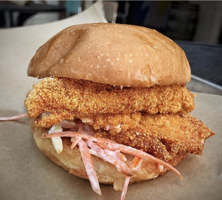 What: Fried Hot Catfish Sandwich – fried catfish, hot sauce and coleslaw on a white bun