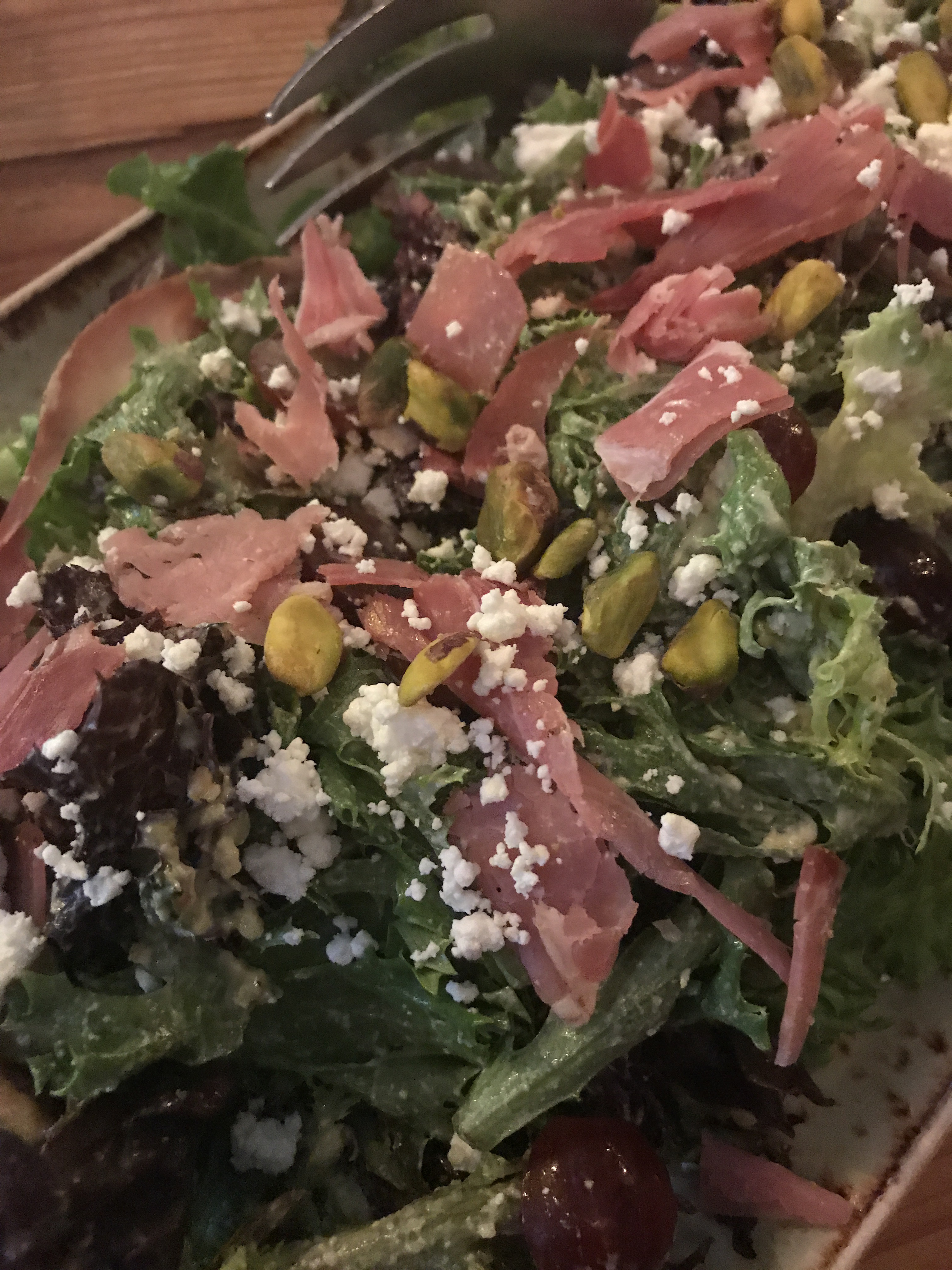 What: The Nutty Grape – Mixed greens, prosciutto, red grapes, and goat cheese tossed in a pistachio-white balsamic dressing