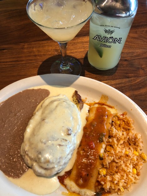 Poblano con Crema, Cheese Enchiladas, Rice, Beans, and Barrel Selected Margarita