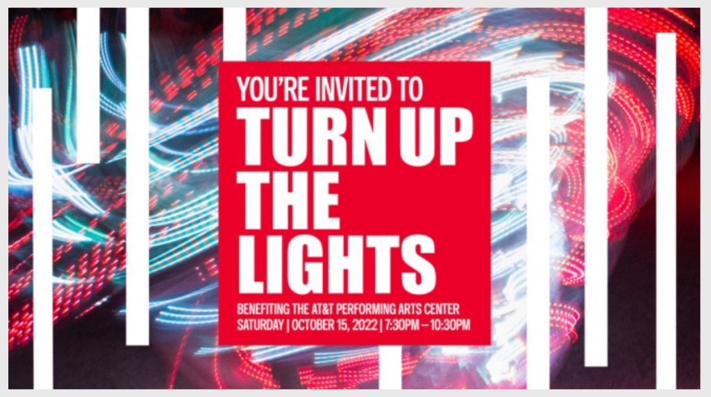 Turn Up The Lights, an event benefiting for the AT&T Performing Arts Center, takes place on October 15 and kicks off with a cocktail reception at 7:30 pm in Sammons Park with beats by DJ NaturalHiiigh and a special performance by Bandan Koro African Drum and Dance Ensemble.